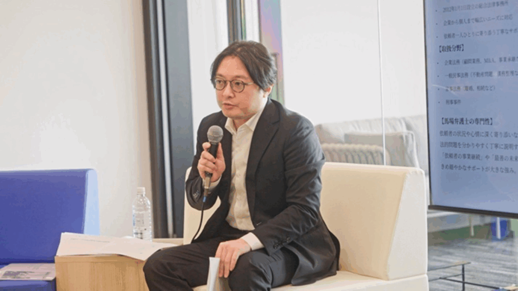 パネルディスカッションは、「経営と法から考える事業承継〜リアルな現場と専門家の視点〜」と題して行われ、馬場弁護士が登壇。事業承継を経験した株式会社北海サンコーの若狭博徳社長と「事業承継のリアルと備え」についてお話しました。馬場からは、「事業承継の法的視点」、「よくある事業承継のトラブルと対策について」を中心に解説いたしました。